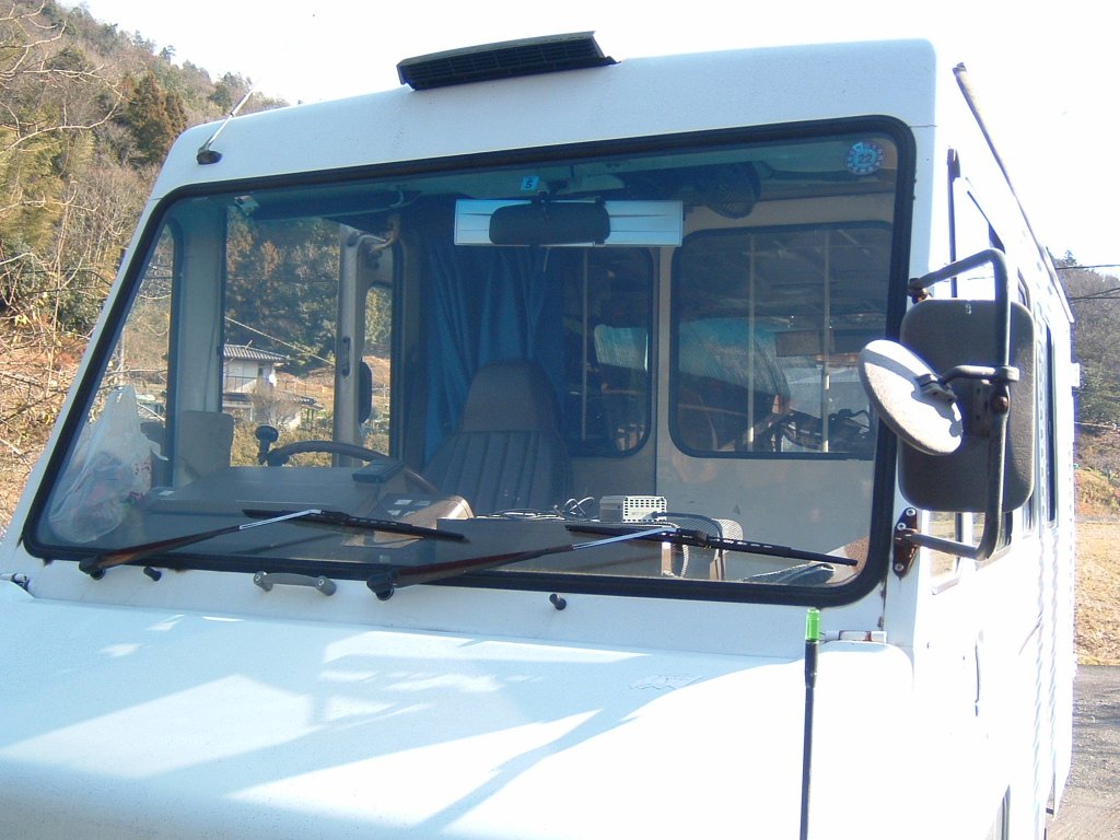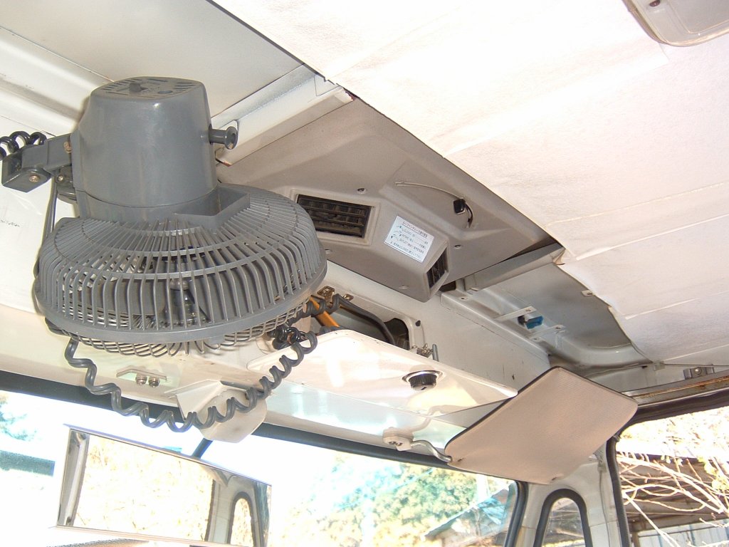 写真左:前面ガラス上に取り付けられたベンチレーターの導入口。手前の扇風機は社外品と思われます。