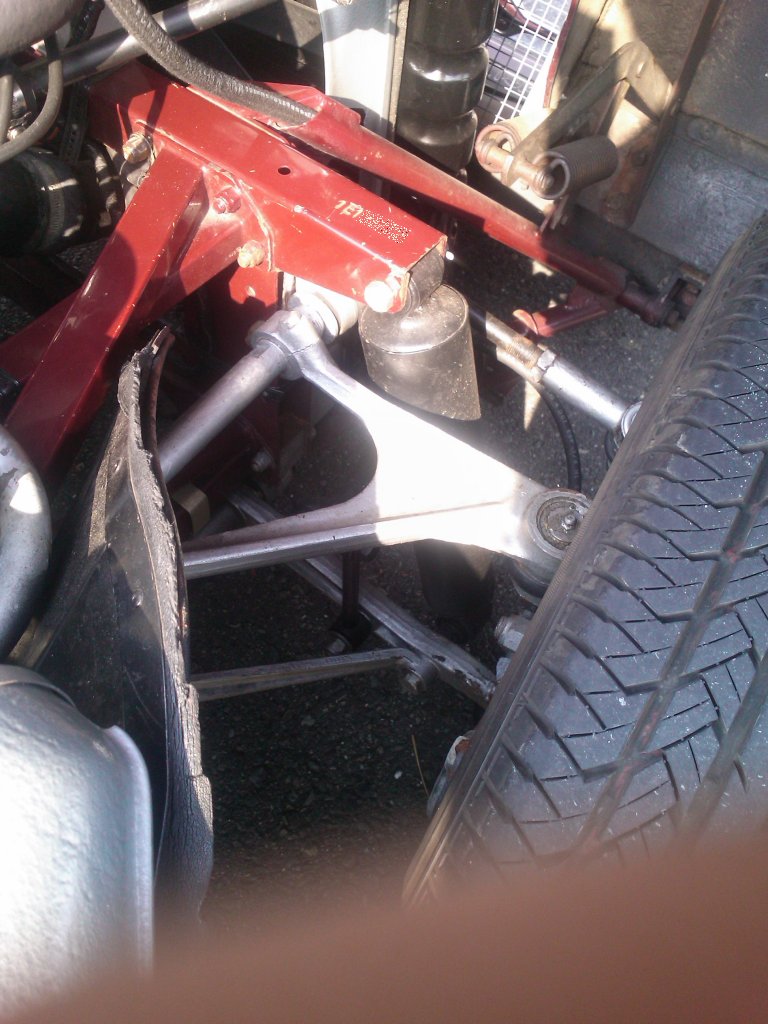 フロントのダブルウィッシュボーン式サスペンション。チューブラーフレームに搭載されたアーム類がレーシングカーの系譜を感じさせます。