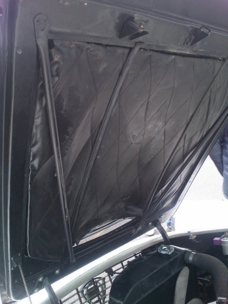 逆アリゲータ式のボンネットフードを開けると、さすがは高級サルーン。消音効果を狙ったと思われる、しっかりとした内張りが奢られていました。