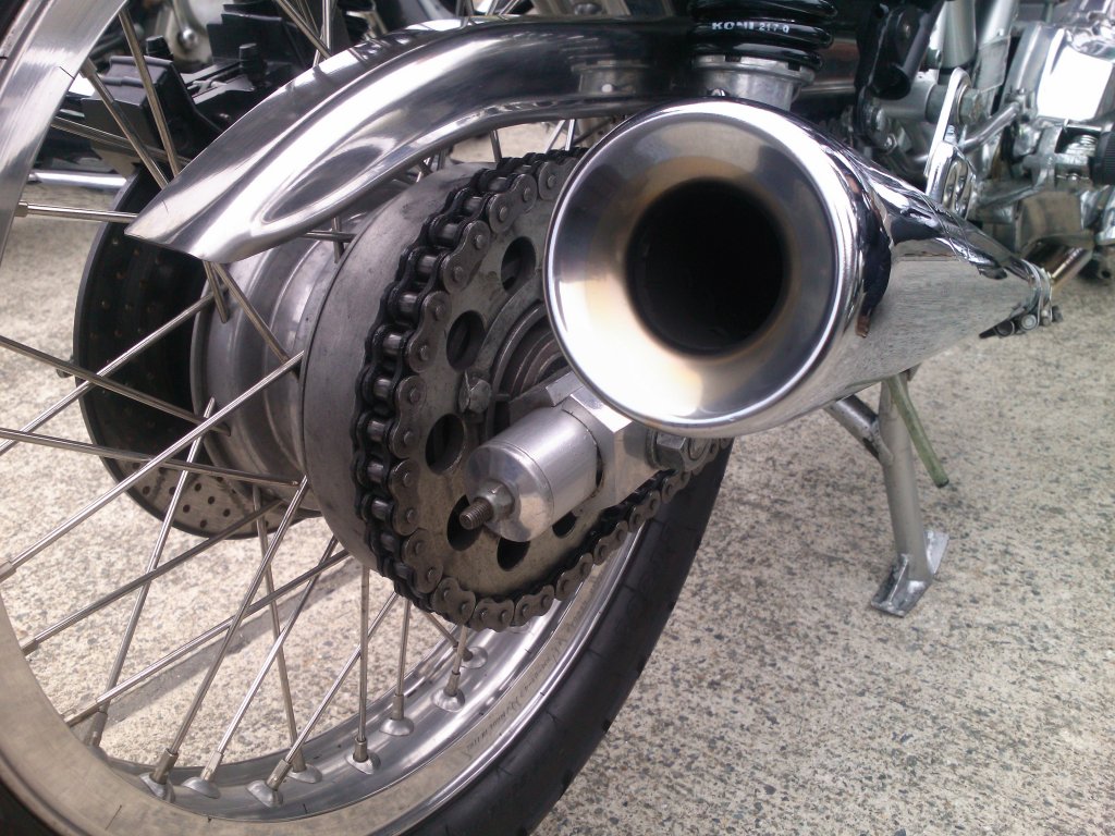 まっすぐ延びたエキゾーストマフラーの左下に見える、スイングアームの形状の美しいこと!