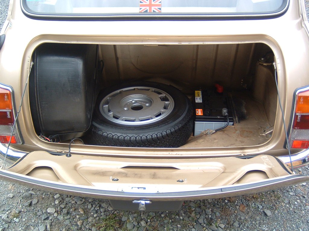 初代ミニは、ハッチバックではなく、このようにトランクルームが下に開くようになっています。